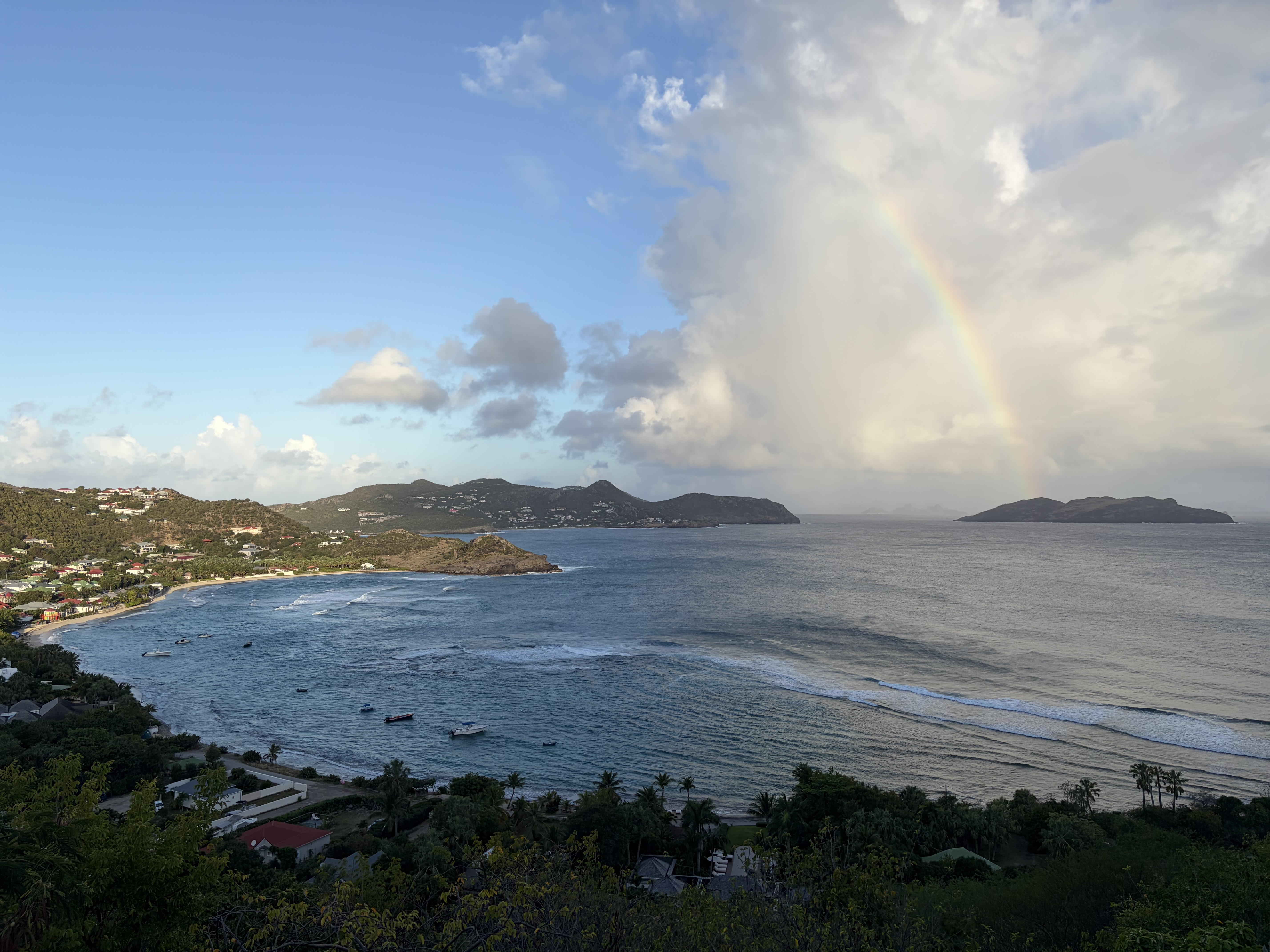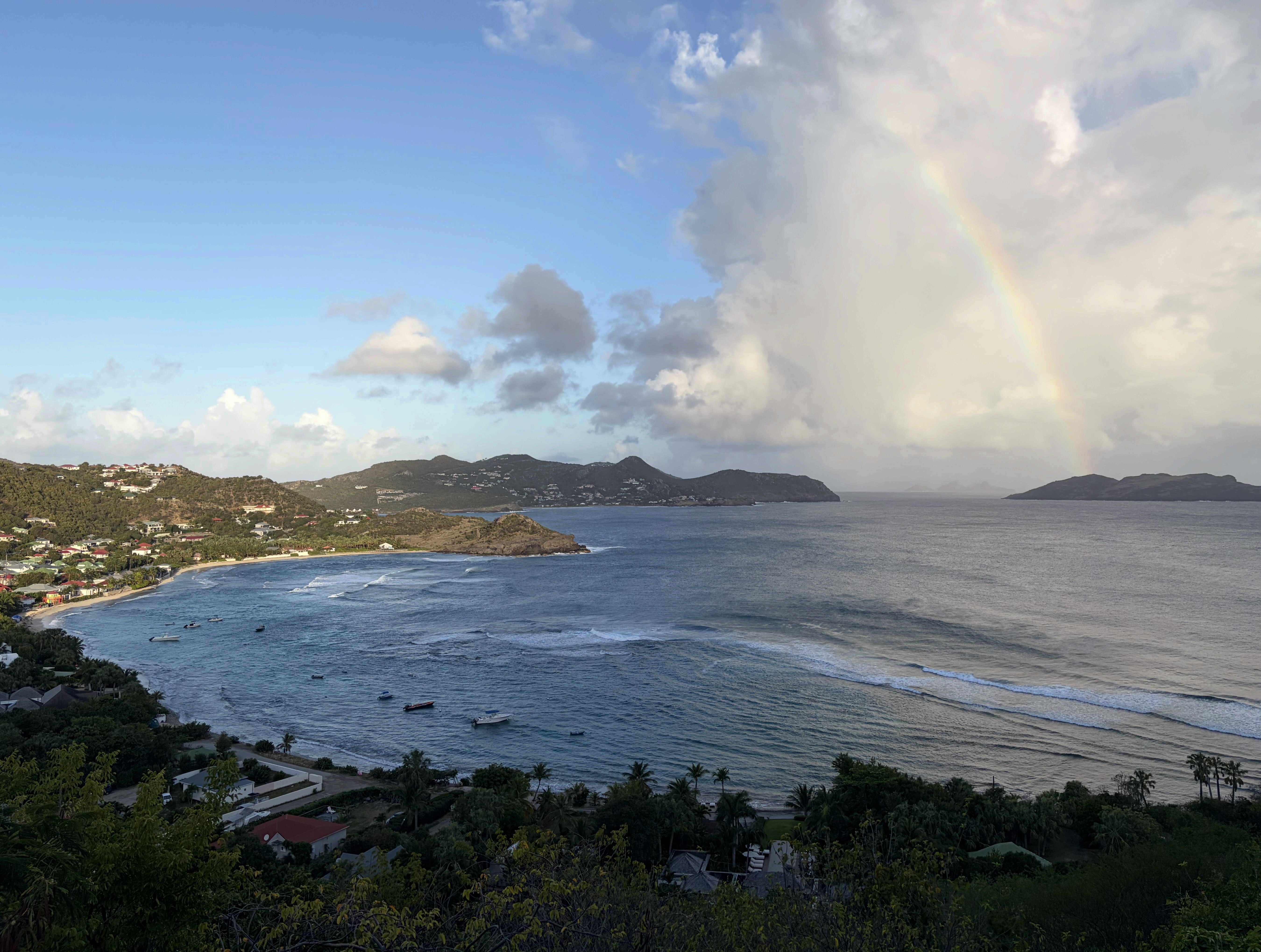 - Rainbows in the distance over ile Fregate despite no apparent rain.