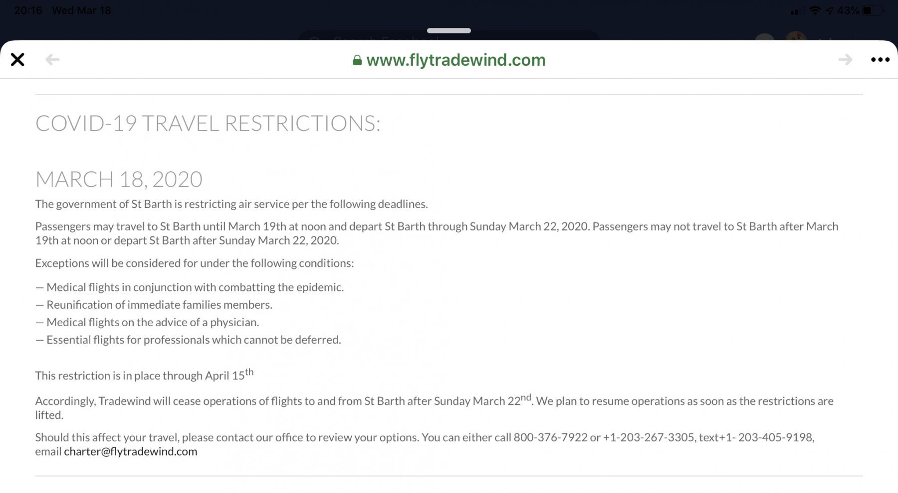 There is now a complete beach ban in effect. Also banned is access to hiking trails, and bicycling or running several kilometers from your home. My impression is that the original limitations were being stretched or ignored, moreso in La Metropole than on SBH, so the leash has been shortened for all. The French government really wants people to stick close to home, and to stay physically separated.